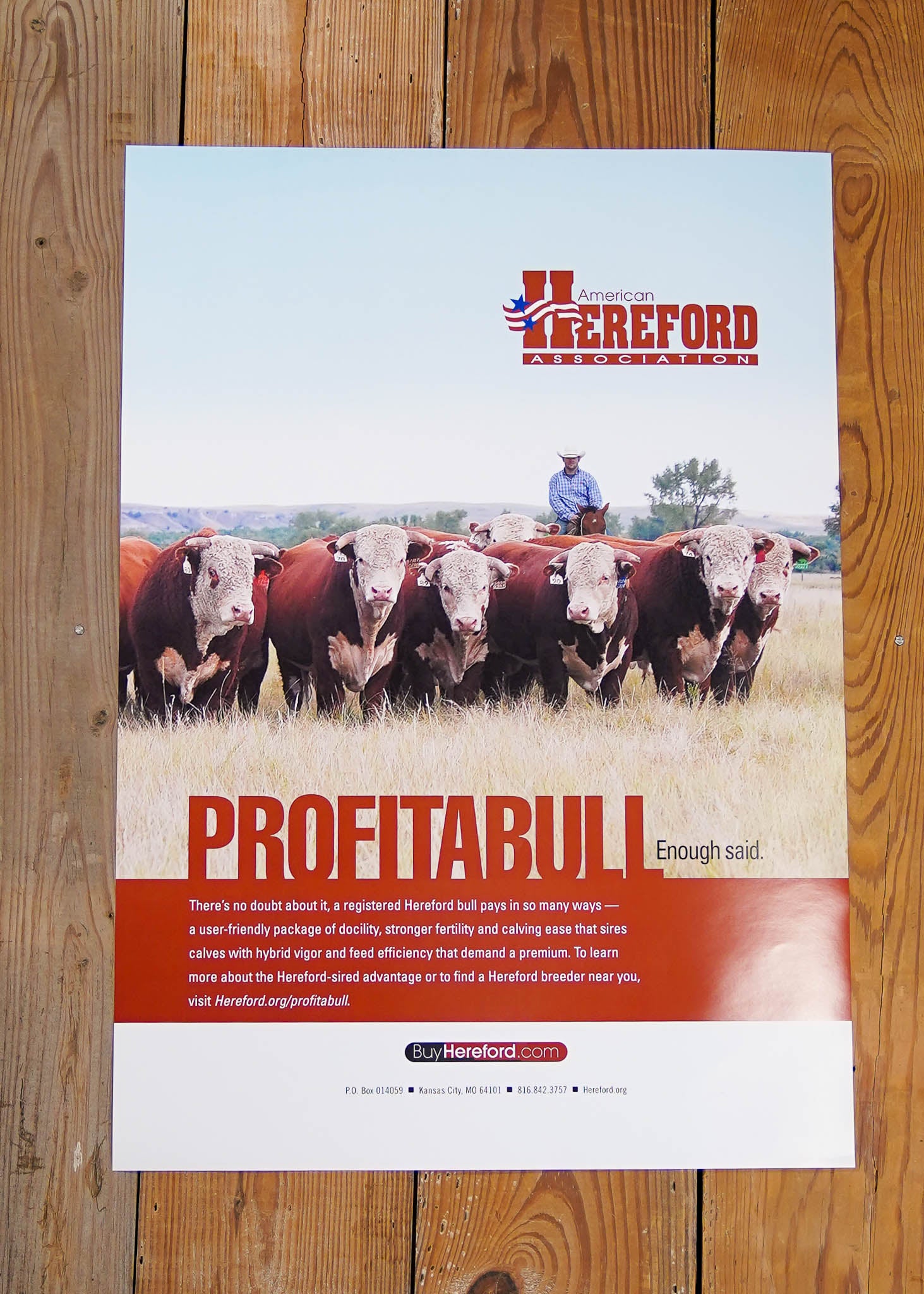 There are 2 poster images with the slogan "This bull produces better mamas, not headaches." This is a 2-sided poster with the horned bull on one side and the polled bull on the other.